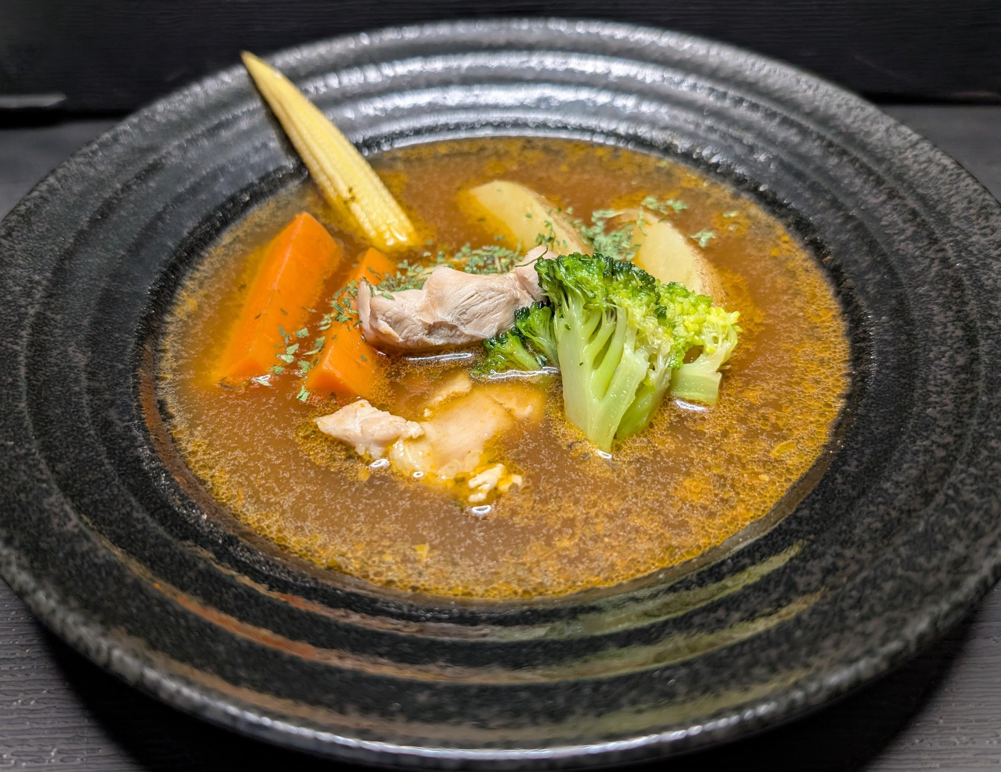 ご当地では有名なベル食品のスープカレーと、じっくり煮込んだ野菜と鶏肉。是非当店の国産米のご飯と一緒にお召し上がりください。
